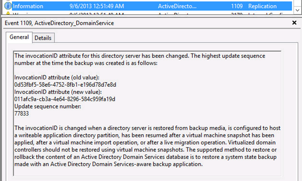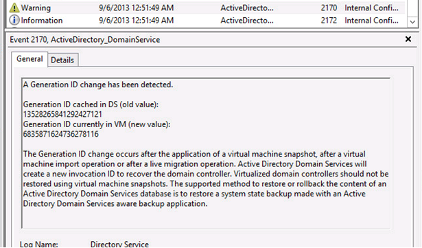 As I have previously discussed in other posts, a change in the “state” of a virtualized Windows Server 2012 machine WILL result in a change in its VM-GenerationID (GenID). This change in GenID will automatically trigger a series of responses from the operating system. IF the VM is a Domain Controller (DC), the DC is compelled to do the following: