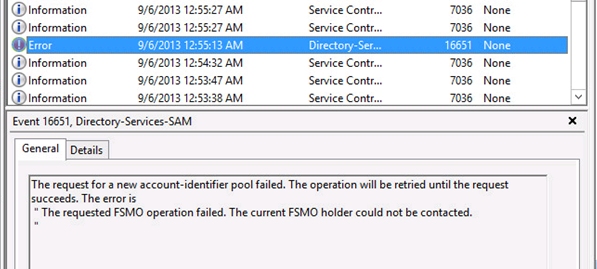 - Restart the Directory Service on the FSMO role-holder after its replication partner has fully started (NOTE: This may fail if you try to do this through the Services applet. Use the Powershell command (restart-service NTDS -force) instead.